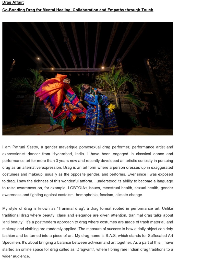 Patruni Chidananda Sastry is a classical dancer, intrapreneur and customer service expert. Patruni started dancing at the age of seven and their unique style called ‘Expressionism’ is a new way to tell stories of awareness to the society. Patruni has also been performing the Indian Tranimal style of drag, which draws inspiration from folk artforms such as Pagativesham and Behroopiya. They have given more than a thousand performances and five hundred digital shows in India and across the world. They have been a Tedx speaker five times, and a keynote speaker at Deloitte, Uber, Amazon, Microsoft and many other organizations. They co-founded Dragvanti an online website for the drag community in India.