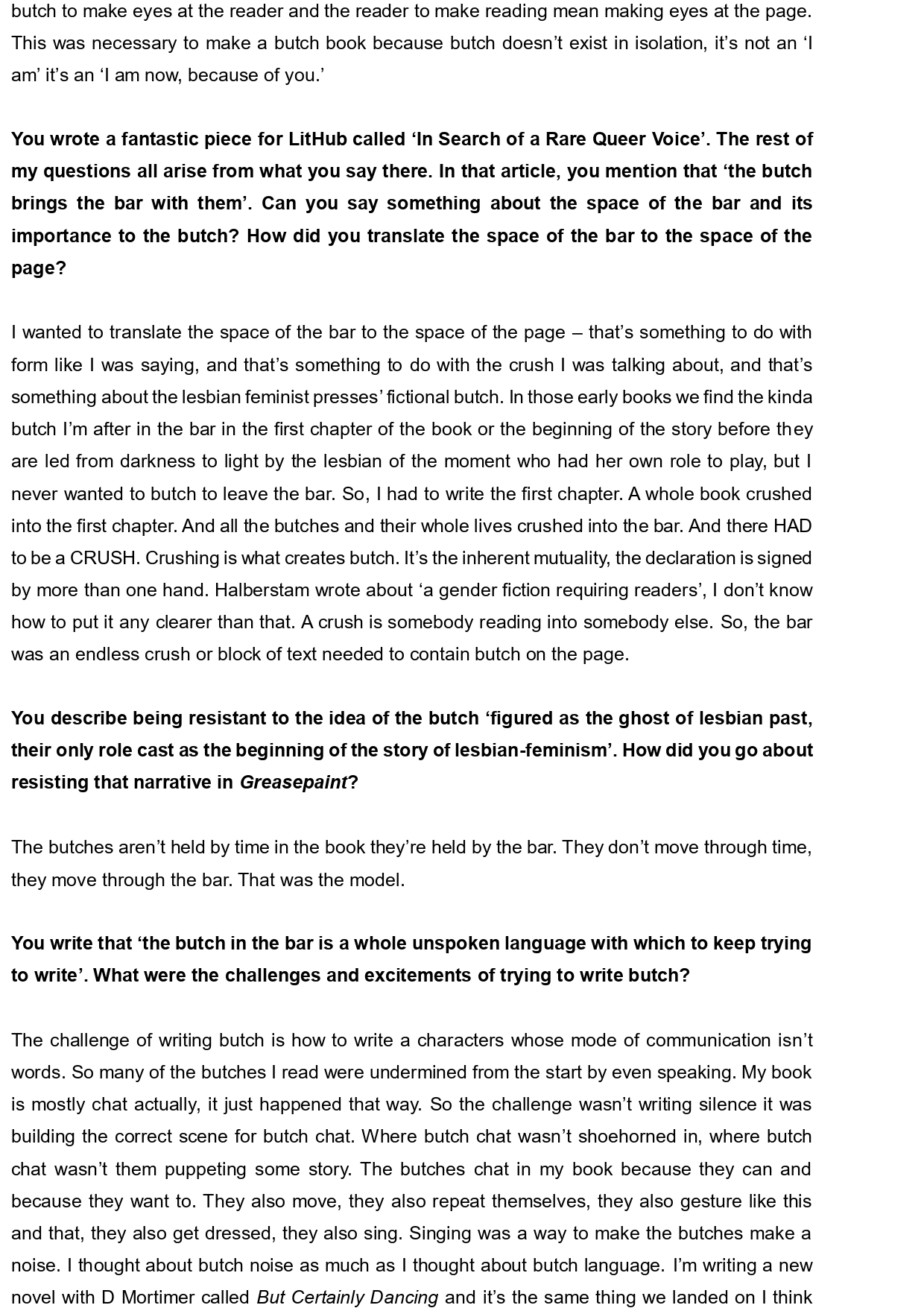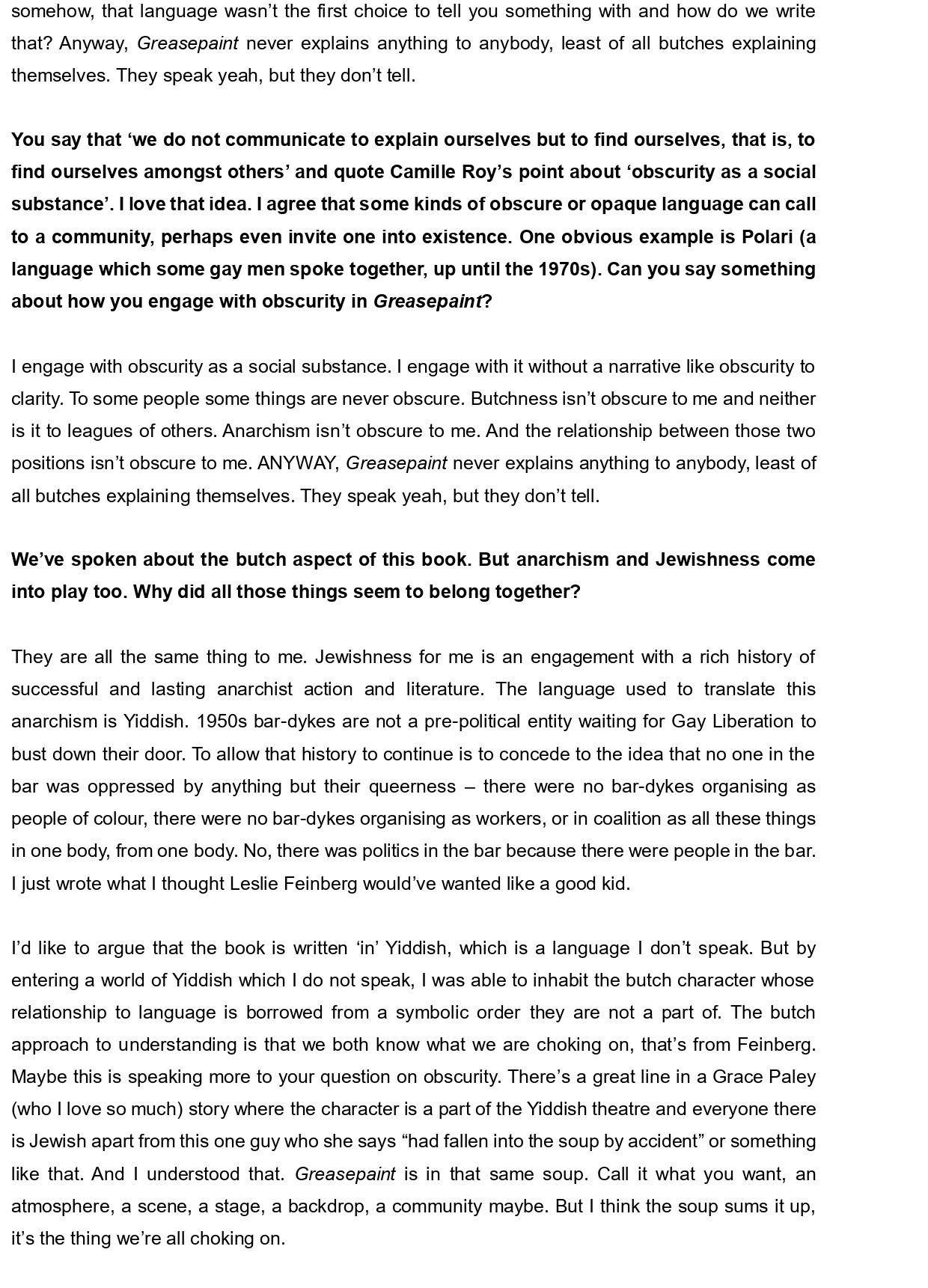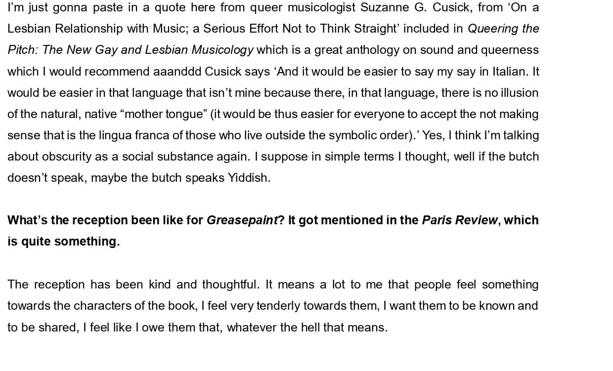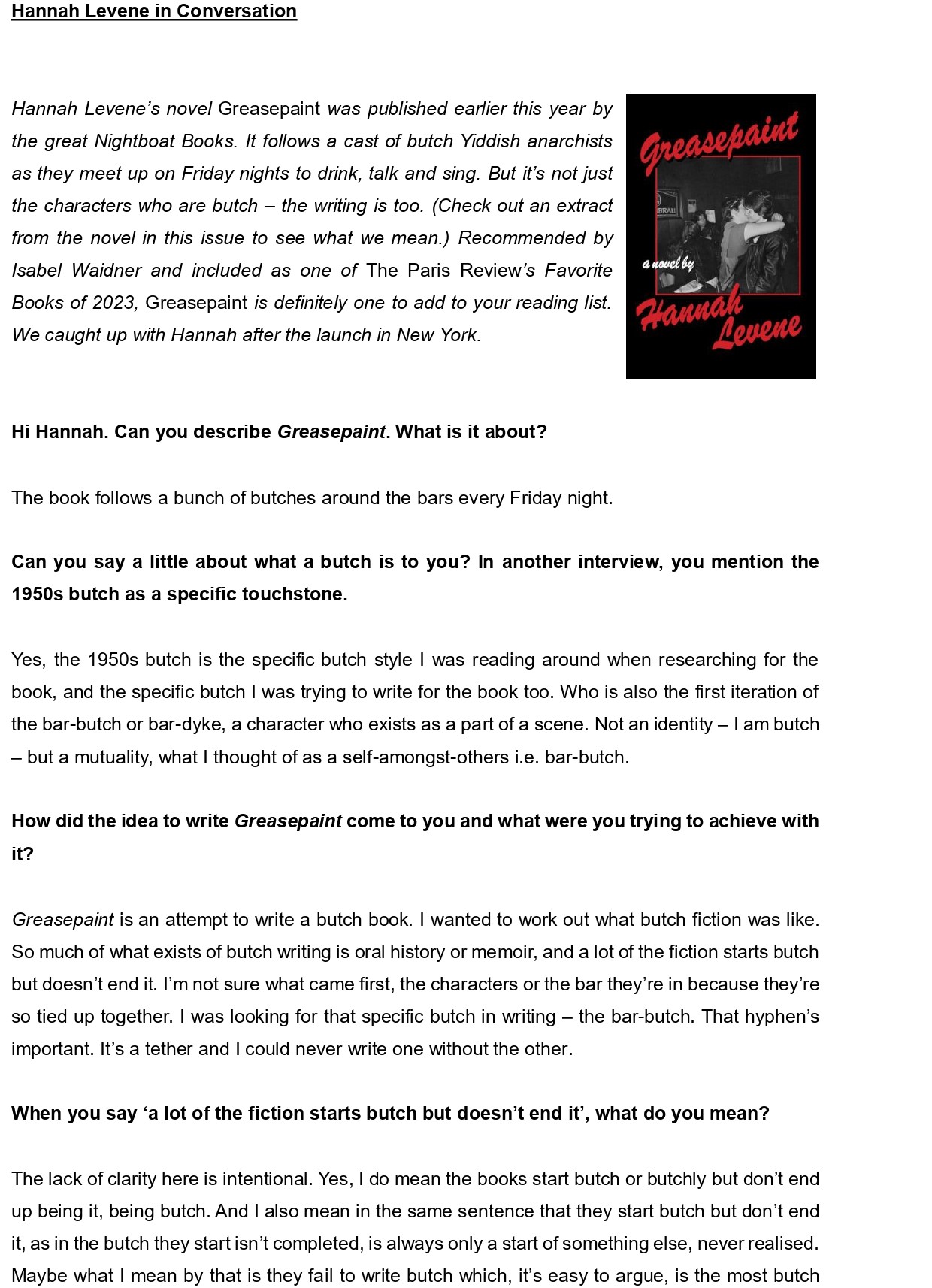 Hannah Levene lives and writes in Norwich. Her prose and poetry has been published online at Blackbox Manifold, Hotel, Datableed, Fenwomen, and LitHub amongst others. She holds a PhD in Creative Writing from the University of Roehampton exploring the composition of new butch literature. Her novel Greasepaint is available from Nightboat Books. She is a former co-editor of Fruit Journal.