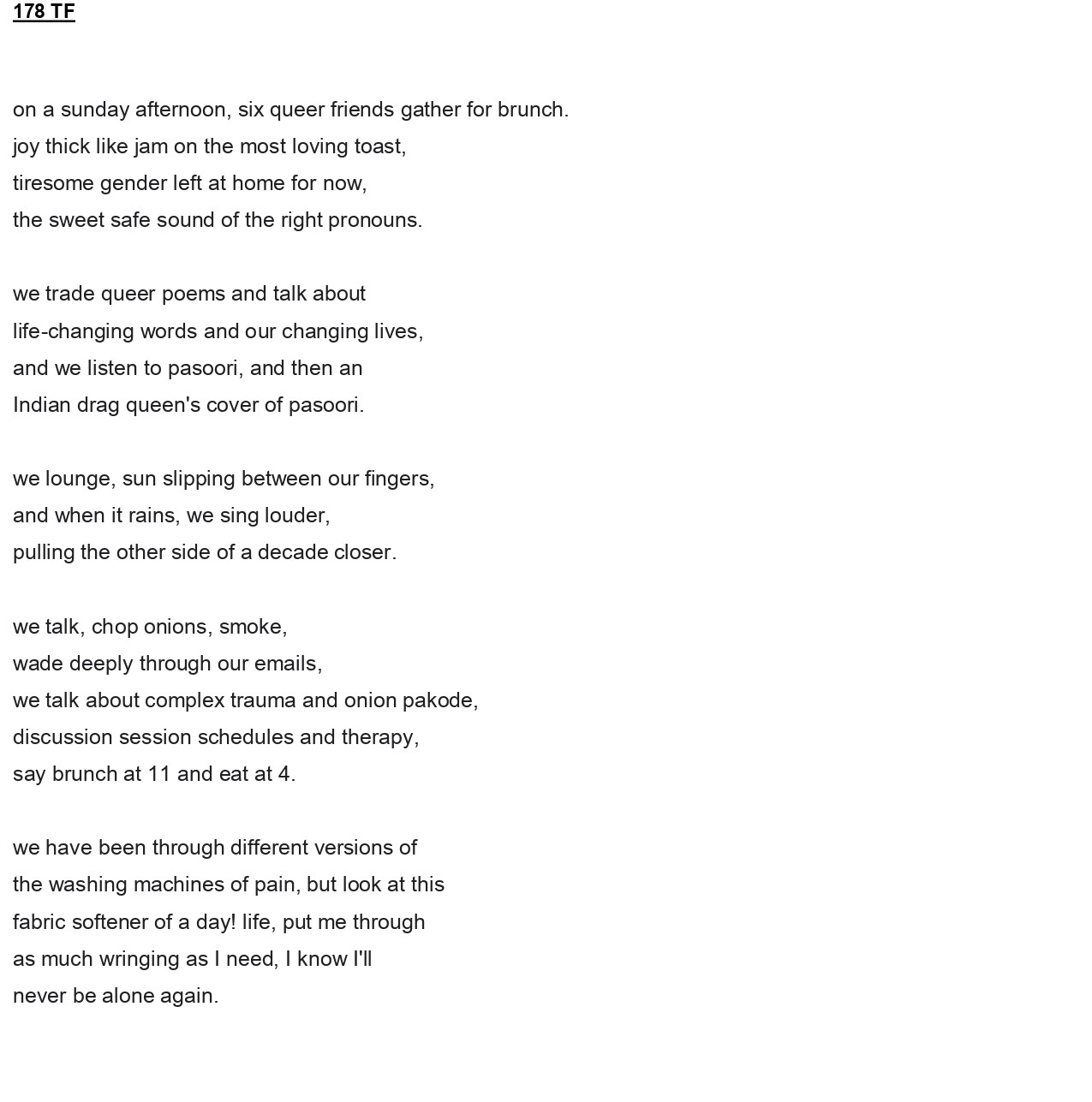Vidushi Rijuta (she/her) is a queer brown woman, currently doing a full-time masters in counselling and psychotherapy, and part-time chasing after cats trying to befriend them. She loves writing about love (so naturally, about things like queerness, joy, friendship and grief).