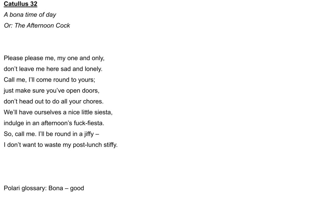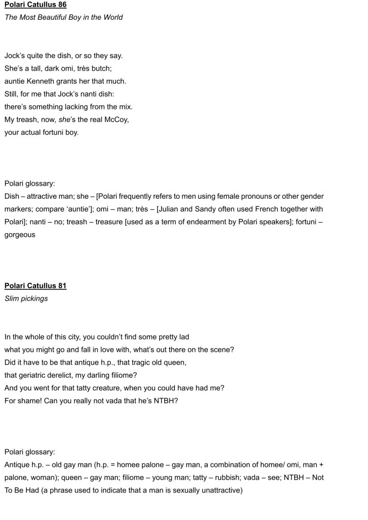 Jennifer Ingleheart’s day job is Professor of Latin at Durham University, where she explores Rome’s role in LGBTQ+ history. Her Polari (per)versions of the Roman poet Catullus are designed to be read out loud with a slight Cockney accent, and can also be found in Shearsman and Stand magazines. She has performed at Polari Literary Salon and the National Centre for Writing.