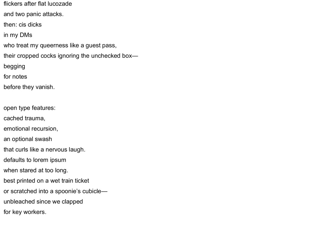 Redd Glass lives in Toronto. Their work has appeared most recently in