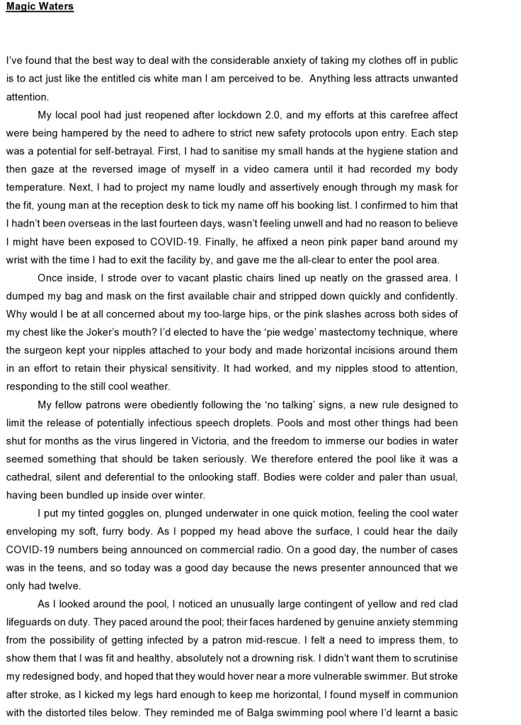 Sam Elkin is a trans masculine writer, arts worker and producer of the podcasts Transgender Warriors, Transdemic and Queer View Mirror. Born in the UK and raised on Noongar land, Sam now lives on the unceded lands of the Wurundjeri people of the Kulin Nation in Melbourne, Australia. Sam is currently working on a debut collection of essays about gender identity and the law.